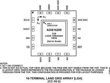 ADIS16209采用9.2 mm × 9.2 mm × 3.9 mm LGA封装,工作温度范围为-40°C~+125°C,可使用符合RoHS标准的回流焊接工艺。
