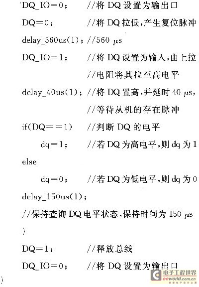 其中,变量dq用来判断DSl8B20是否有返回的存在脉冲,为O即有返回脉冲,表明复位成功,可跳出循环;DQ表示总线的电平,当总线为高电平时DQ为1,否则为0;DQ_IO用来表示DQ所连的单片机I/O口的状态,若该I/O口对单片机是作为输入使用则DQ_IO为1,作为输出使用则DQ_IO为O。